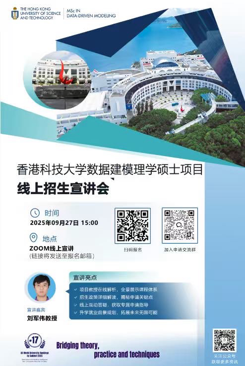 香港科技大学数据建模硕士学位项目 MSc(DDM)招生 线上专场宣讲会宣讲时间:2025年 0 9 月 2 7 日(周六) 15:00 宣讲地点:ZOOM线上宣...