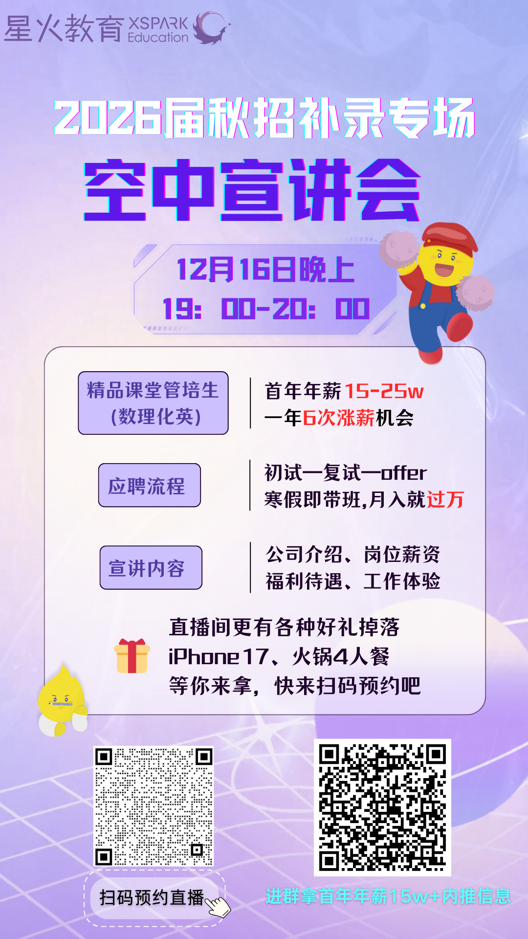 【首年15w-25w】星火教育广州分公司26届秋招宣讲,职等你来!!宣讲时间:11月20日17:00-18:00直播链接:https://xhgz-hrm.xi...