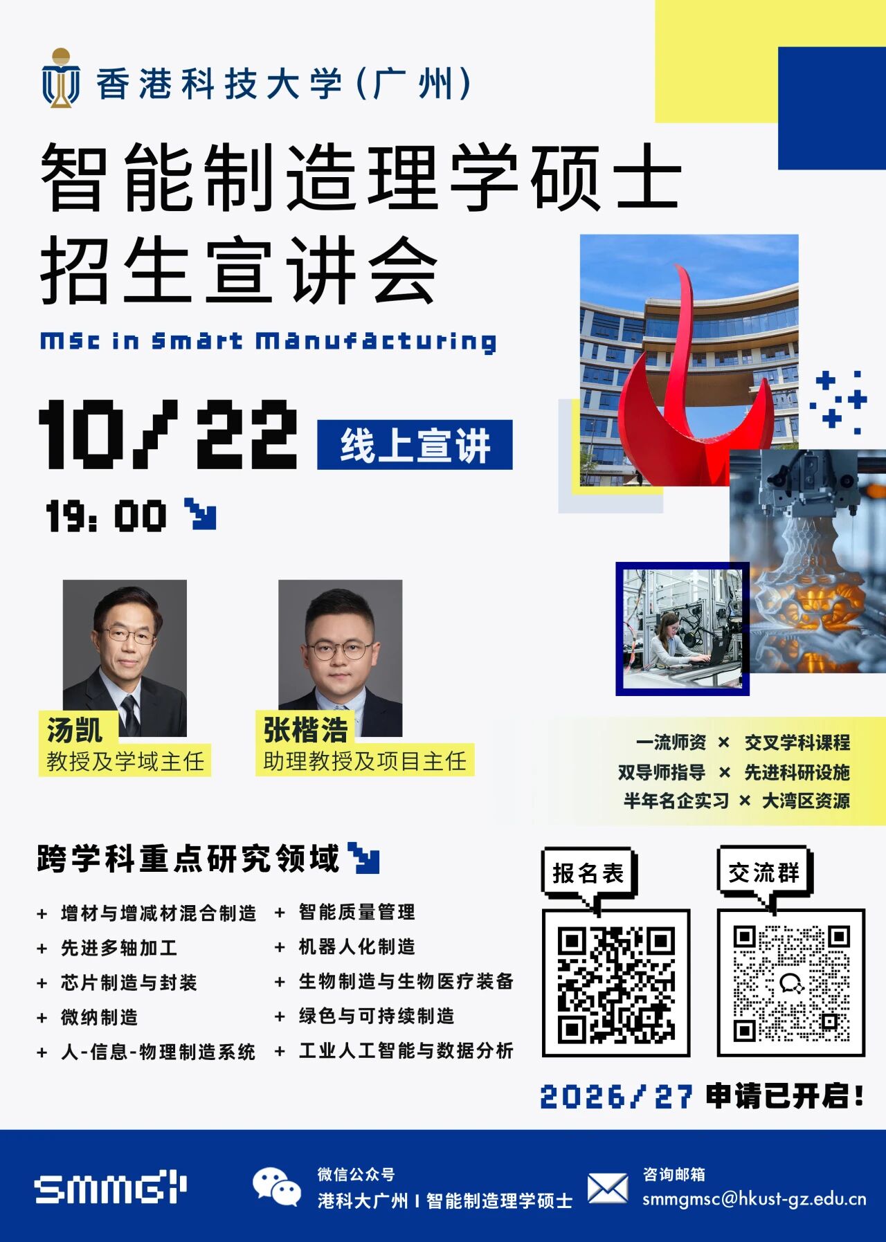 [已结束]香港科技大学广州|智能制造学域 SMMG 理学硕士招生线上宣讲会